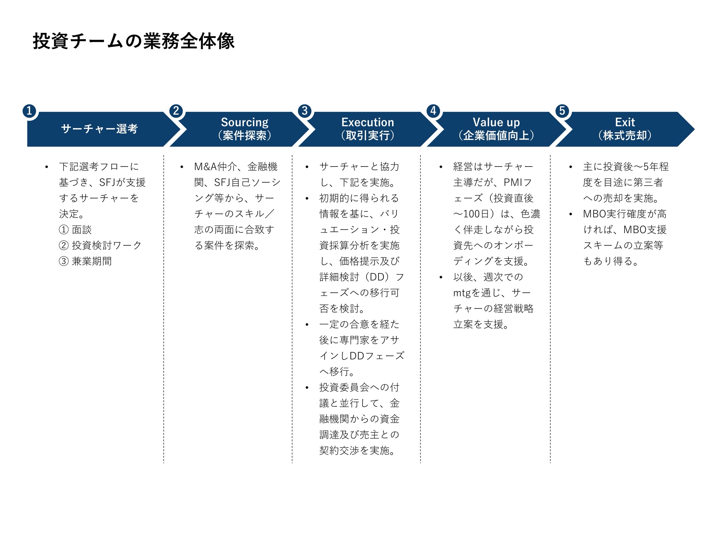 (安藤)SFJの業務は、サーチャー選考から始まります。ご縁のあったサーチャーの伴走支援としては、ソーシングの支援や検討案件に対しての壁打ちを行い、投資委員会へ向けて事業理解や投資仮説の構築をサポートしています。その後のエグゼキューションフェーズでは、バリュエーションや投資ストラクチャー検討、資金調達など様々なタスクをサーチャーと二人三脚で実行していきます。